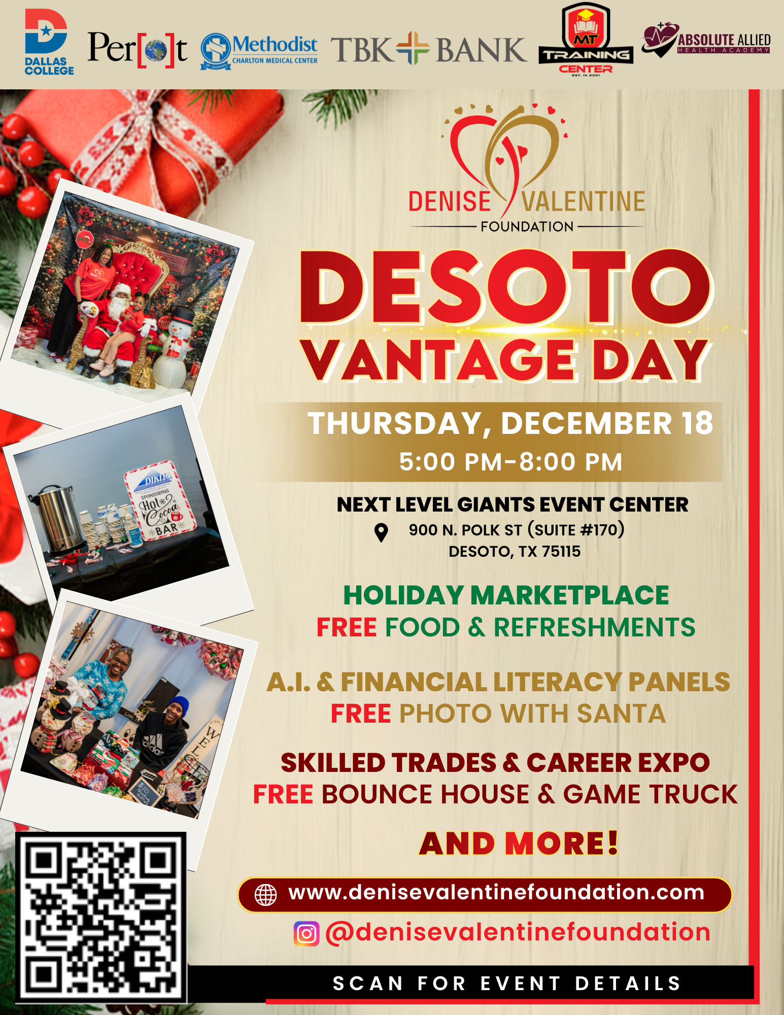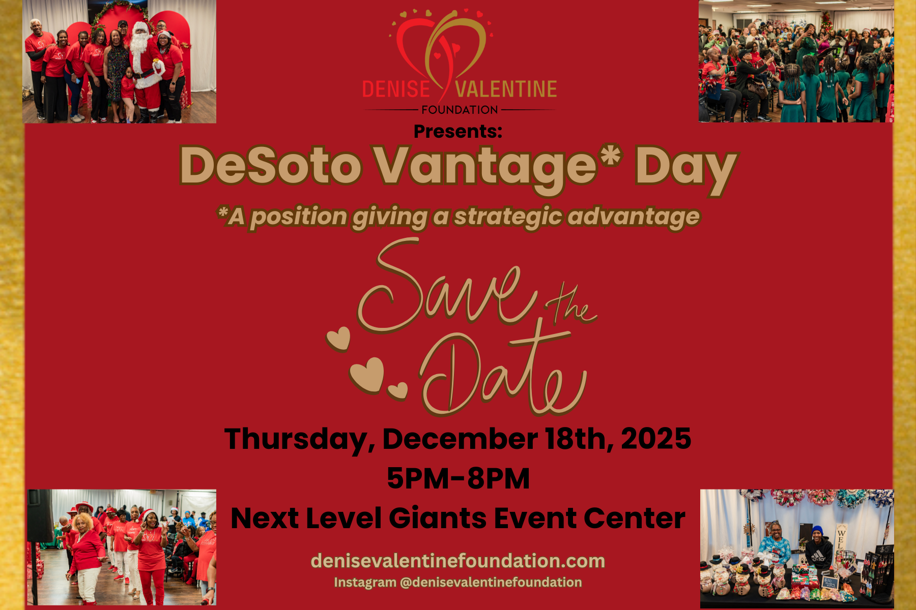 Each year, on Denise Valentine Day, the foundation hosts DeSoto Vantage Day, an event that brings the community together to share knowledge, strengthen opportunities, support local businesses, and raise funds for scholarships awarded to high school seniors in DeSoto.