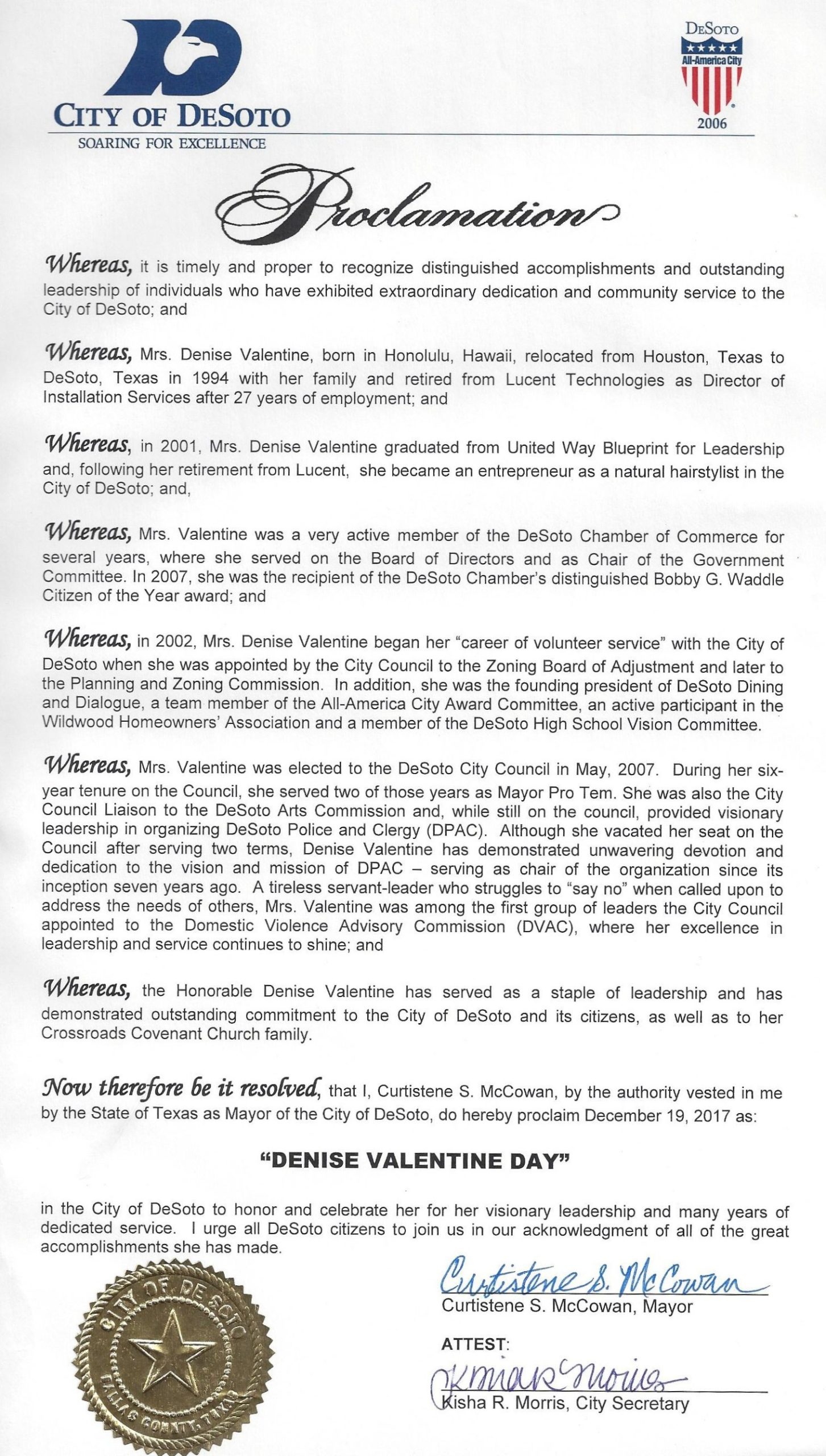 Denise’s unwavering commitment to the City of DeSoto has earned her numerous accolades, including the Bobby Waddle Citizen of the Year Award in 2006 and the Curtistene McCowan Citizenship Award in 2023. In recognition of her lasting impact, in 2017, the City of DeSoto proclaimed December 19th, as Denise Valentine Day.